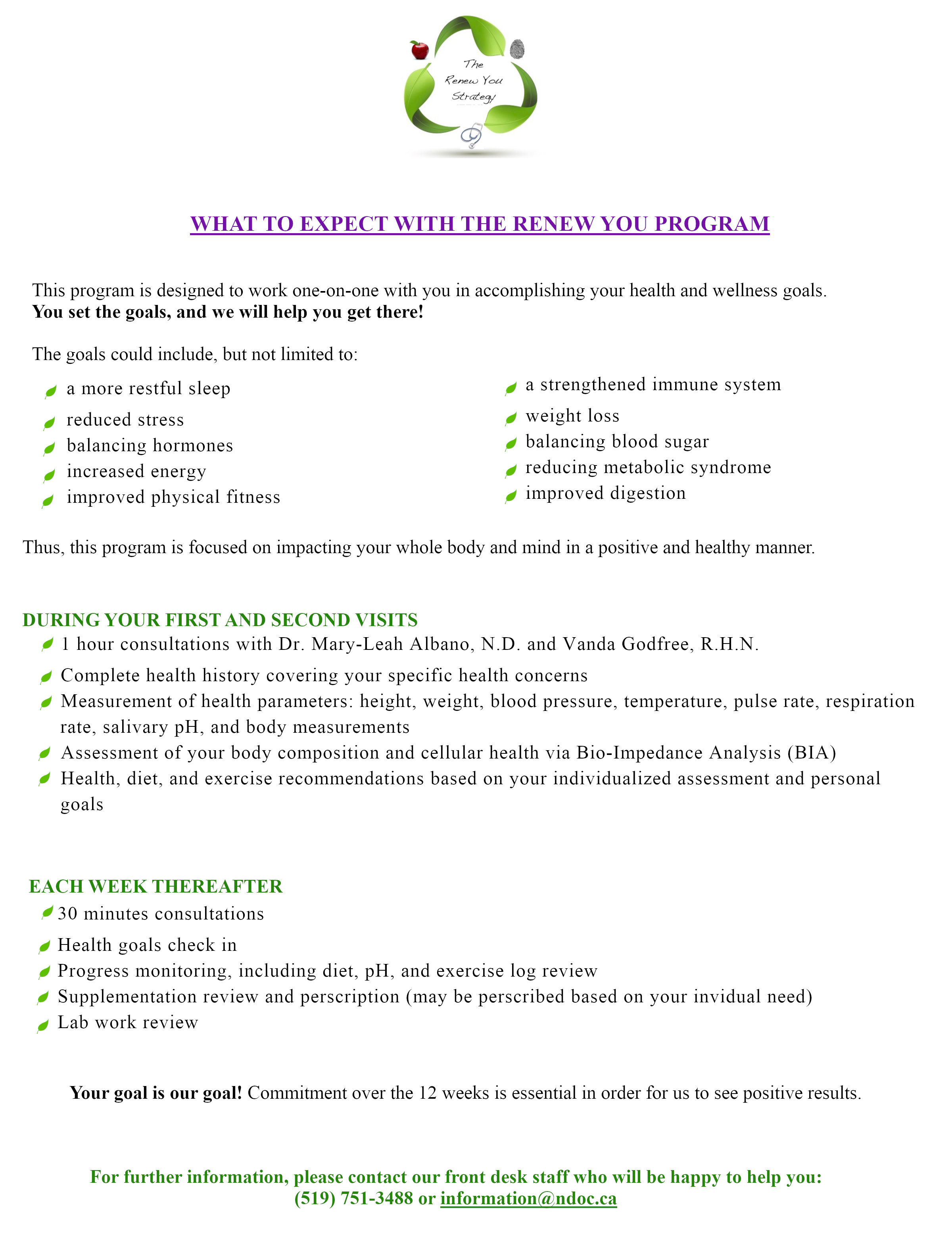 The Renew You Strategy is a 12-week medically supervised wellness program consisting of weekly consultations with Dr. Albano, ND and Vanda Godfree, RHN. Common health concerns for joining the program have included weight loss, improving energy, lowering cholesterol, sleep, balancing digestion, reducing pain and inflammation, to name a few.